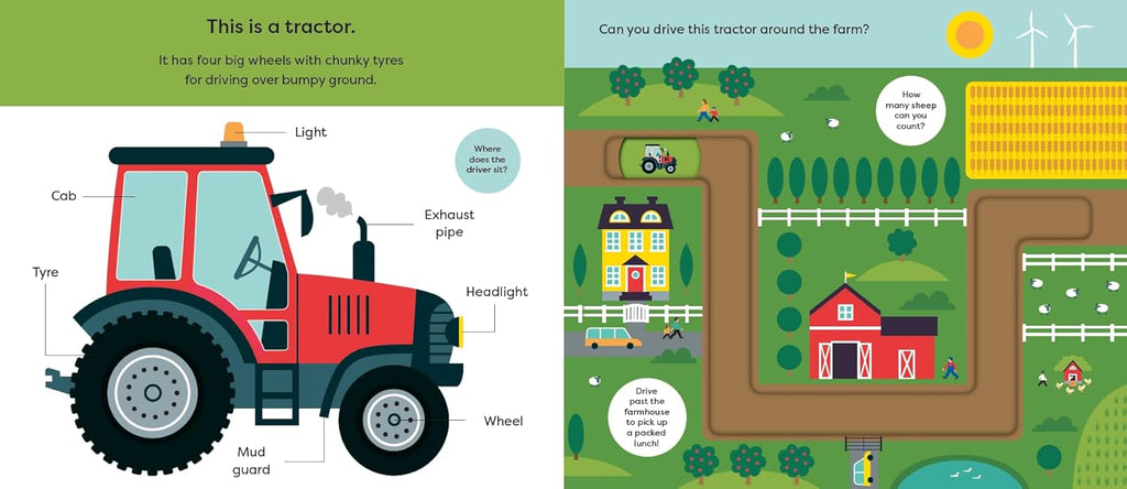 Learn vehicle vocabulary with simple first words, clear diagrams and helpful text prompts to encourage discussion. Then trace the transport around different tracks with a moving counter on every spread and the cover. The perfect book for children who love tractors and combine harvesters - and being in the driving seat!