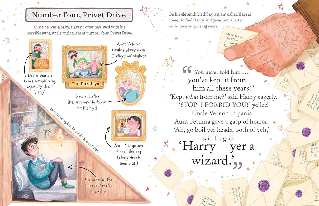 Find out all this and much more about Harry Potter! Peek at Harry in his spidery cupboard under the stairs, find out what he buys in Diagon Alley and explore the Gryffindor dormitory. Get set for dragon encounters, Quidditch thrills, secret passwords and a wand from Ollivanders …