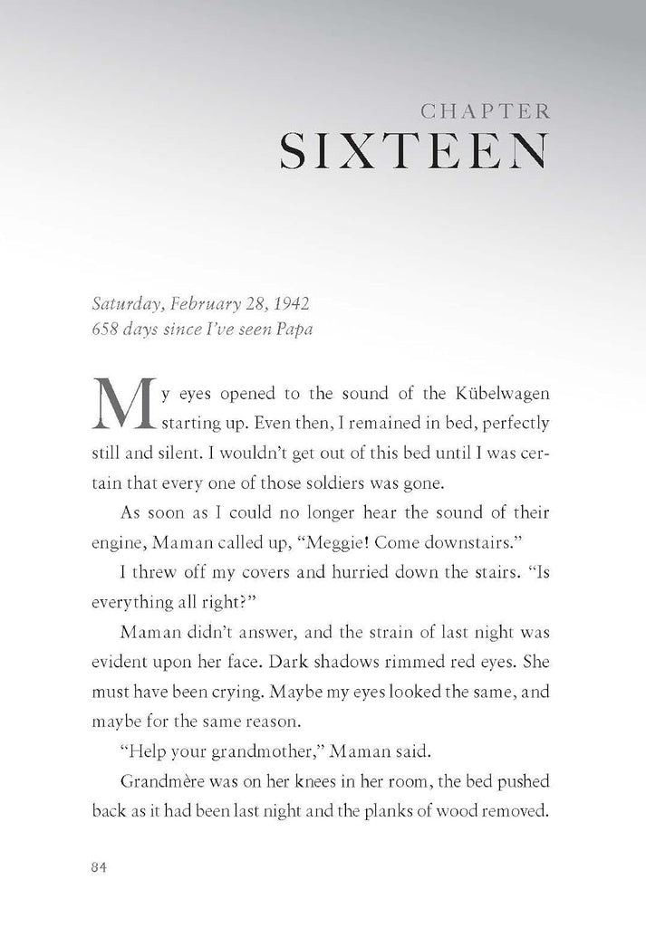 Six hundred and fifty-seven days ago, Meg Kenyon's father left their home in France to fight for the Allies in World War II, and that was the last time Meg saw him. Recently, she heard he was being held prisoner by the Nazis, a terrible sentence from which Meg fears he'll never return. All she has left of him are the codes he placed in a jar for her to decipher, an affectionate game the two of them shared. But the codes are running low, and soon there'll be nothing left of Papa for Meg to hold on to at all.