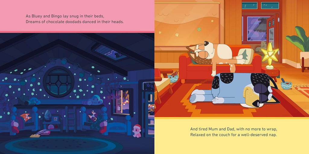 It’s Christmas Eve and Bluey and Bingo are tucked up snug in their beds. When suddenly a noise outside wakes them up . . . Who could it be?