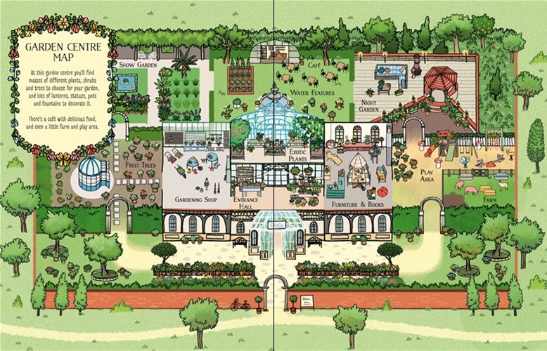 Take a tour through a beautiful garden centre in this detailed sticker book. Discover everything from outdoor plants, a flower shop, exotic indoor plants, garden statues and furniture to garden tools and clothing for gardeners. There’s also an outdoor cafe to visit and a children’s play area with swings, slides and tree houses. Contains stickers of a huge range of trees, shrubs, plants, pots, statues, fountains and seats, and other things found in a large garden centre. Shows a garden and night-time garden. Beautiful full-colour illustrations which the reader can explore.