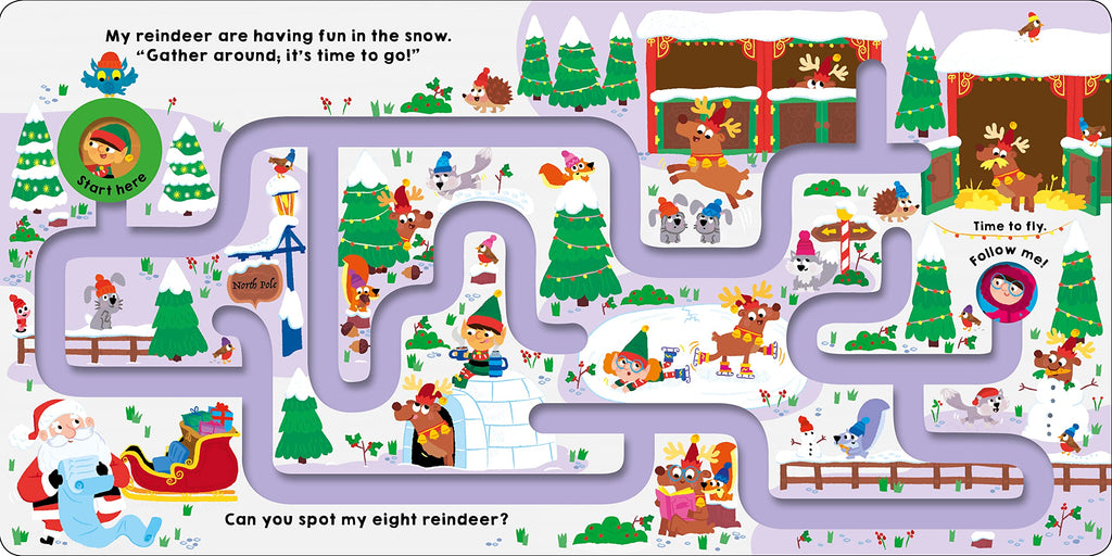 Follow Me Santa is a fun-size, festive maze adventure in the Follow Me series featuring Christmas characters, busy scenes, and finger trails. Follow Santa through colorful, festive scenes on his Christmas Eve journey as he collects the presents, then his reindeer, and travels across the world delivering gifts. Children will love exploring the paths with their fingertips to trace each maze from hole to hole, and meet festive friends along the way! From gifts, to polar bears and children tucked up in bed, there is lots to search for and find. The tracing element is great for developing fine motor skills and the search-and-find activity throughout will help with special awareness. A great book for little hands to explore and a perfect gift for Christmas. Also available: Follow Me, Follow Me Around the World, Follow Me Halloween, and Follow My Heart.