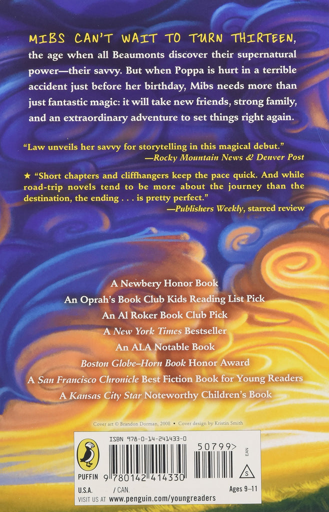 Thirteen is when a Beaumont’s savvy hits—and with one brother who causes hurricanes and another who creates electricity, Mibs Beaumont is eager to see what she gets. But just before the big day, Poppa is in a terrible accident. And now all Mibs wants is a savvy that will save him. In fact, Mibs is so sure she’ll get a powerful savvy that she sneaks a ride to the hospital on a rickety bus with her sibling and the preacher’s kids in tow. After this extraordinary adventure—full of talking tattoos and a kidnapping—not a soul on board will ever be the same.