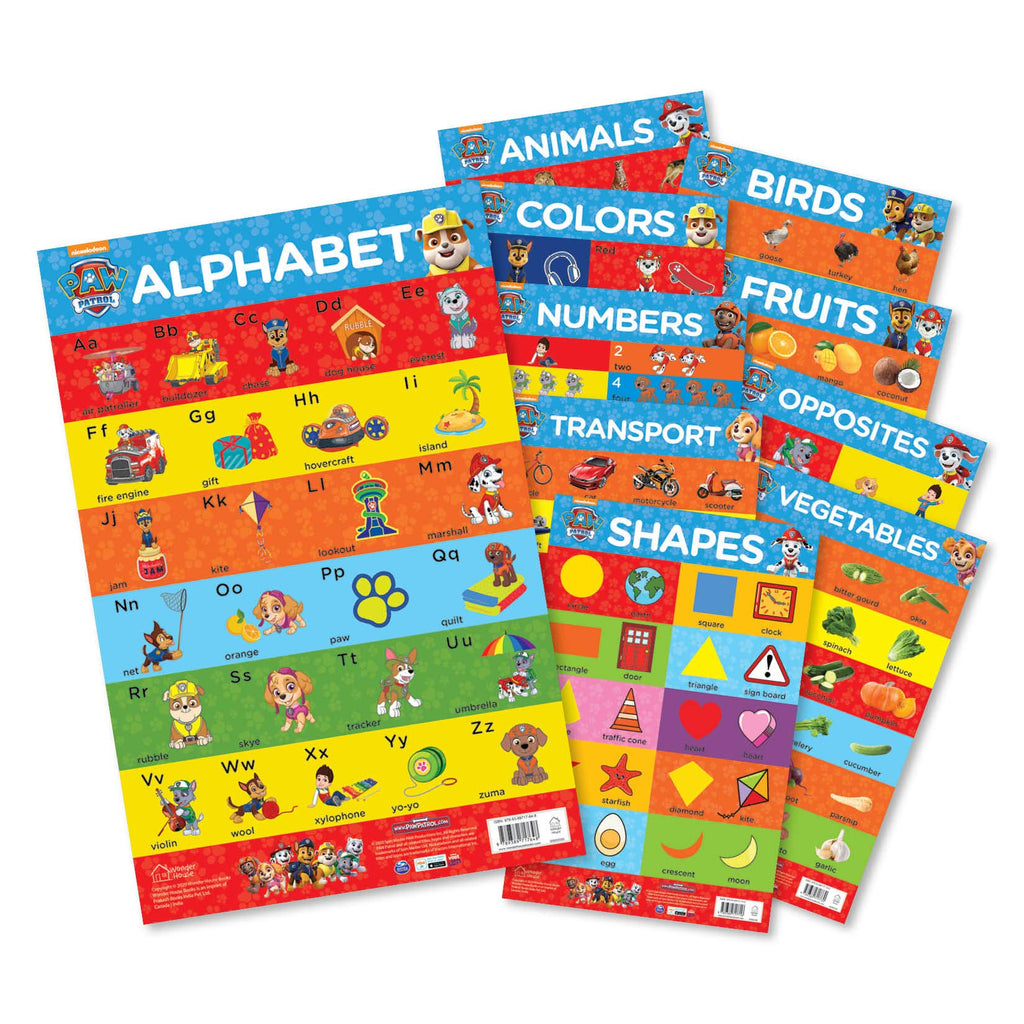 The paw patrol range of charts are fun, interactive and educational. They are ideal for introducing budding scholars to a wide range of everyday concepts. This collection of 10 educational charts have beautiful, vibrant images with accurate word labels to make learning fun and help your little one to learn and remember new concepts. These A3 sized, laminated charts are excellent teaching tool for teachers and great gifting option for pre-schoolers and toddlers. It includes charts on alphabet, numbers 1-20, shapes, colors, fruits, vegetables, birds, animals, transport and opposites. The charts feature chase, Marshall, Skye, and the rest of the funny, furry team from the popular nickleodeon series paw patrol.